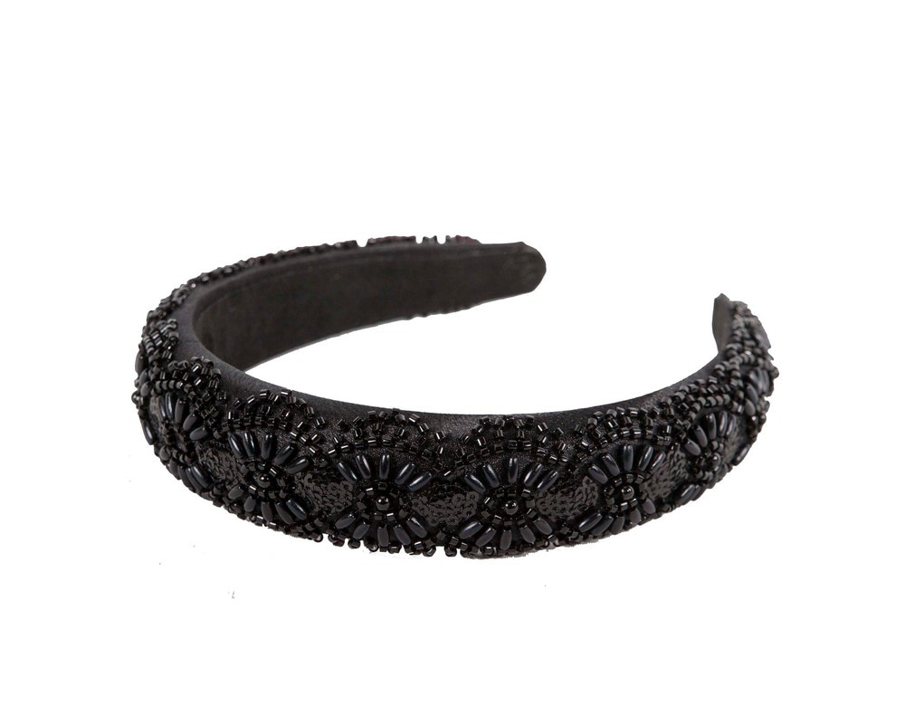 Black fascinator headband by Cupids Millinery. Comfortable headband covered in beads and crystals