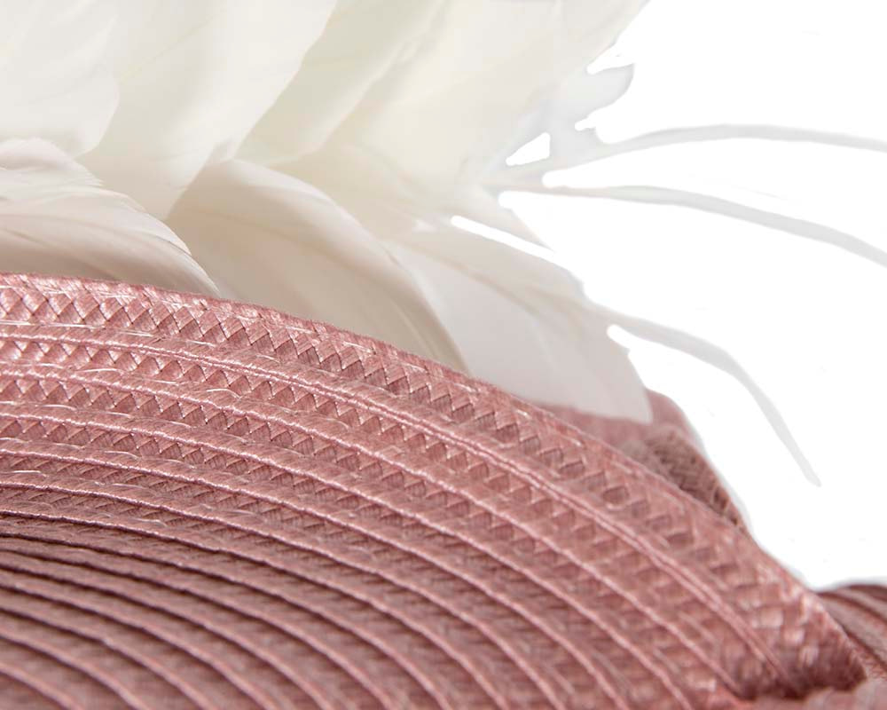 Sculptured dusty pink braid base decorated with white feather flowers. This fascinator will be a great addition to your next spring racing outfit.