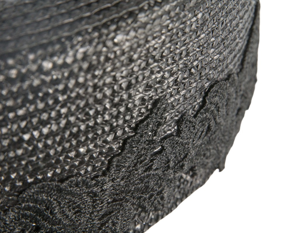 Large black pillbox hat. Hat is made from black braid and dressed in matching lace.