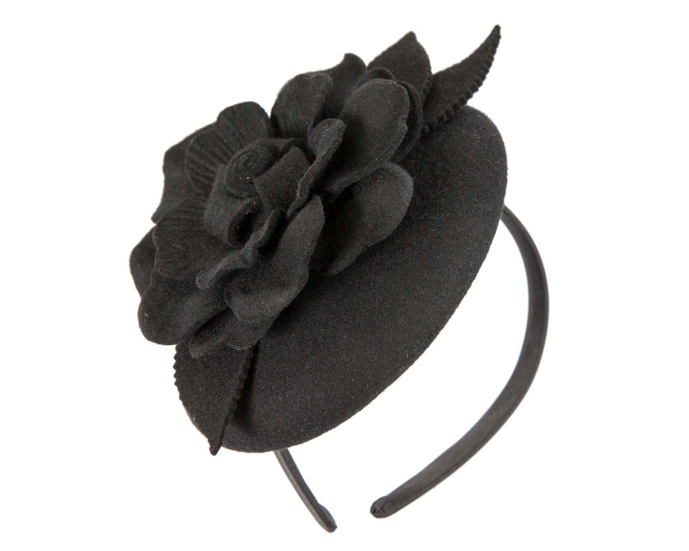 This elegant black fascinator is designed in Australia by Max Alexander. Made from real wool felt, it sports round base with hand-made felt flower.