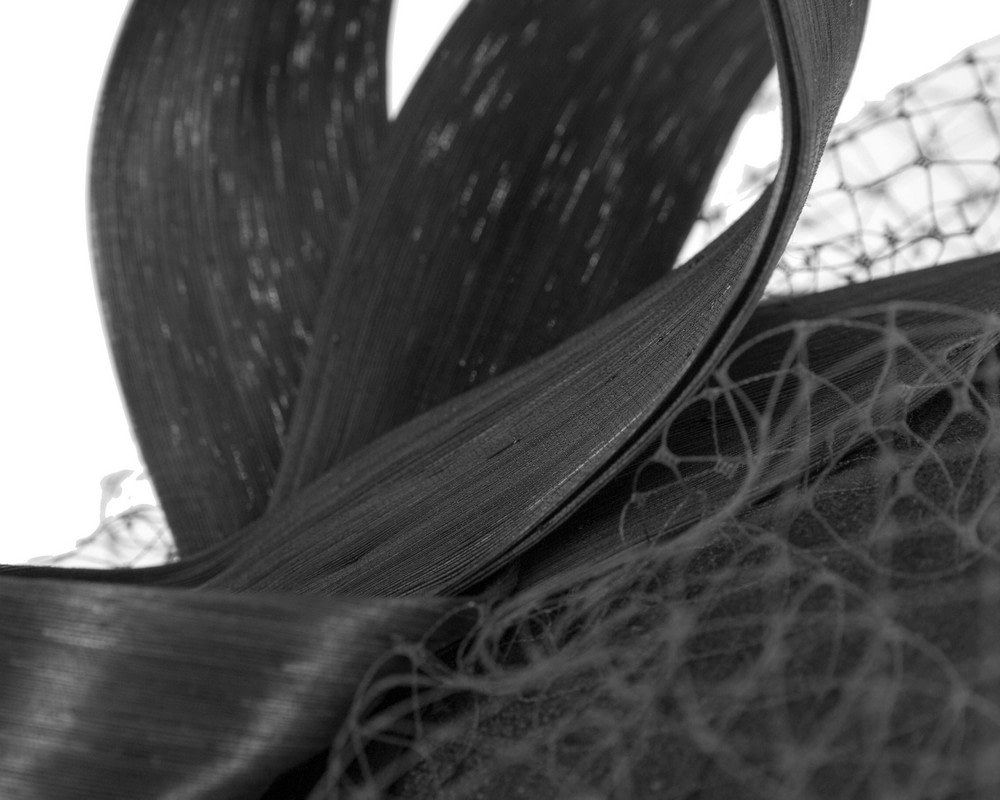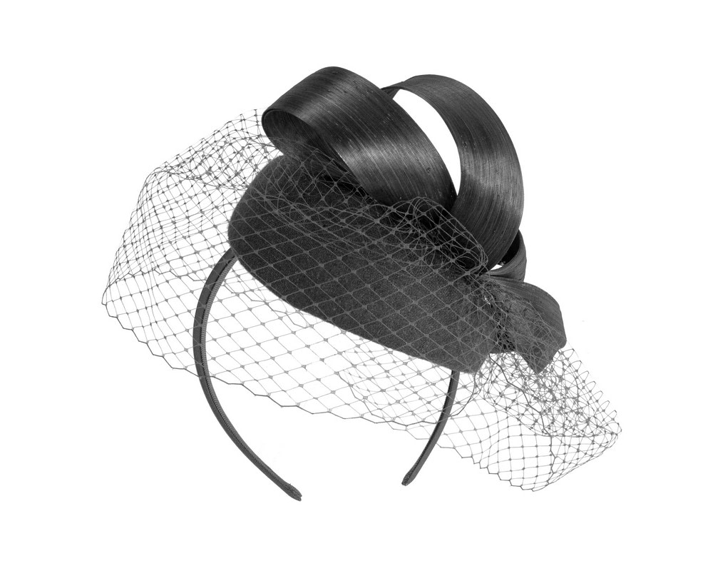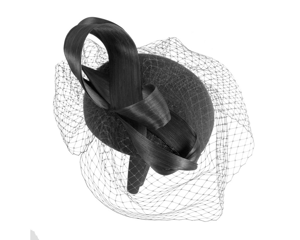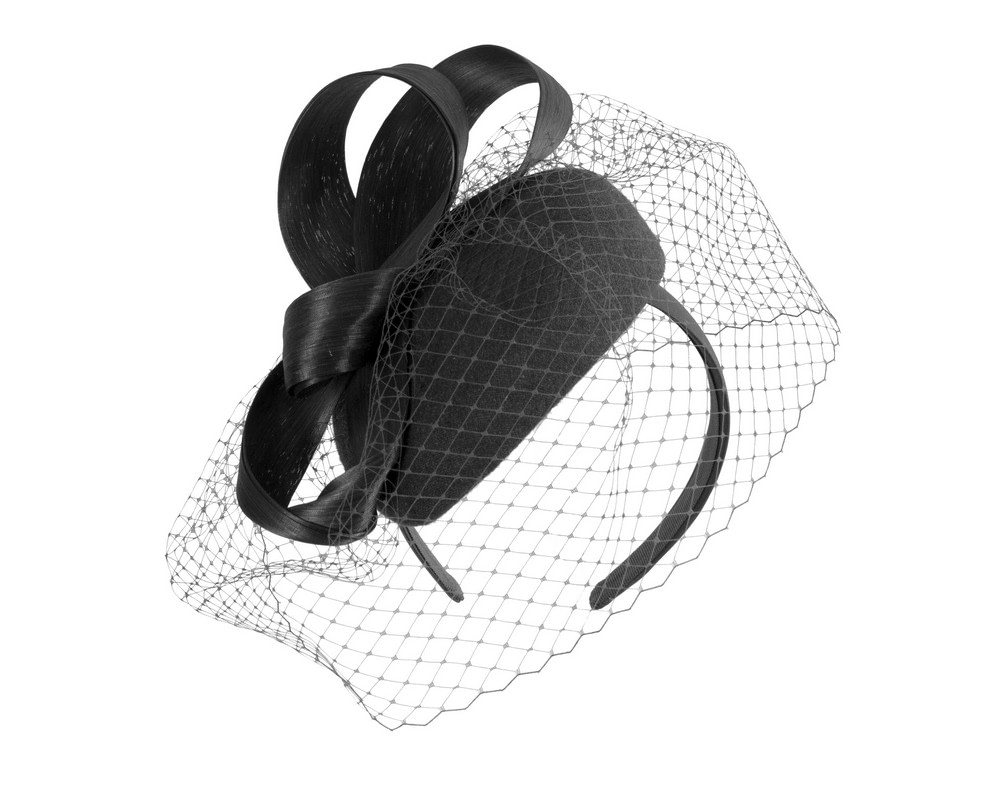 Black woolen pillbox fascinator decorated with matching silk abaca loops. With addition of fashionable face veil, this fascinator will be a great addition to any autumn or winter racing or special occasion outfit.
