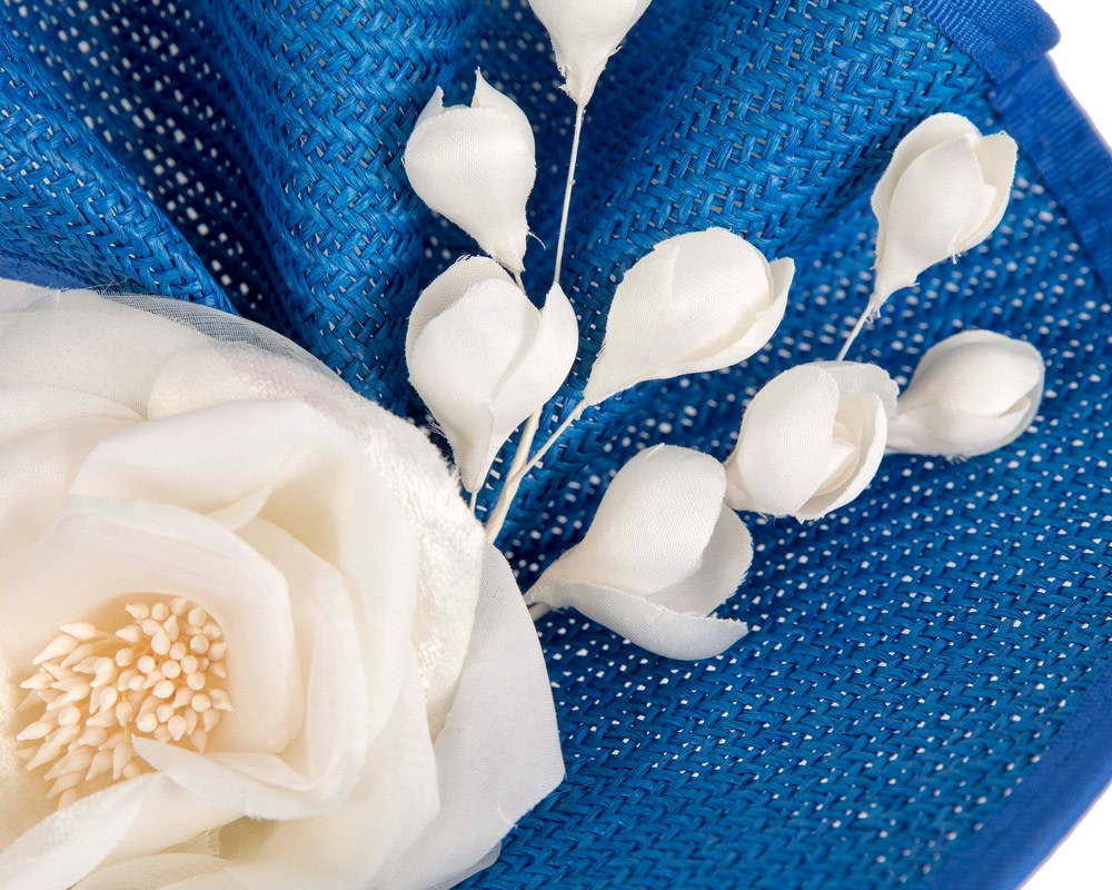 Beautiful royal blue fascinator with contrast cream flower bunch from latest Fillies Collection. Fascinator is placed on the headband. Hand made sculpture and exclusive flower arrangement