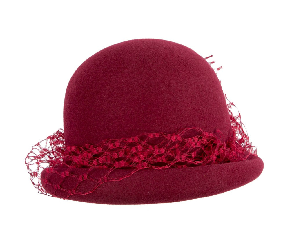 Burgundy wine fashion hat featuring classic cloche design with rolled double brim and face veil. Great choice for everyday smart wear or special occasion.