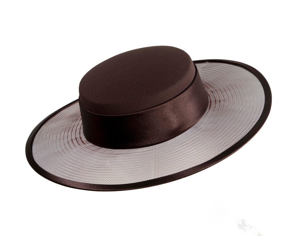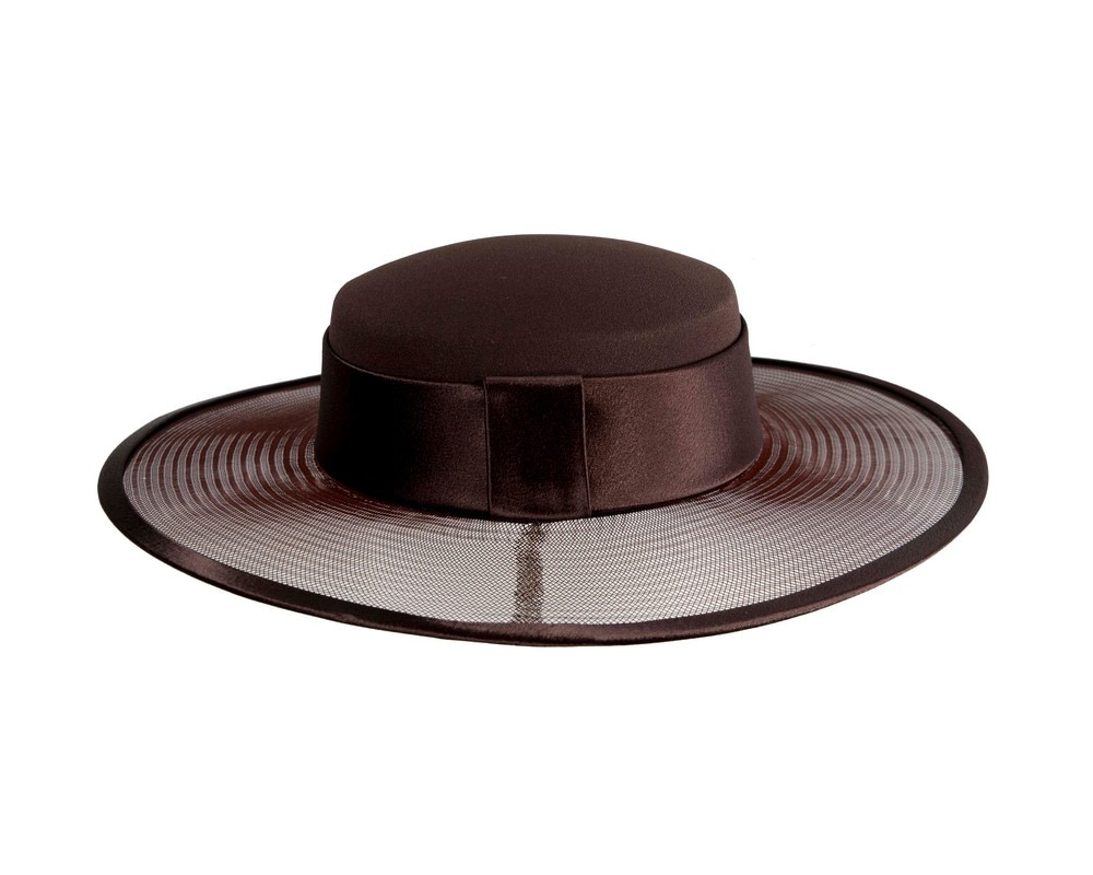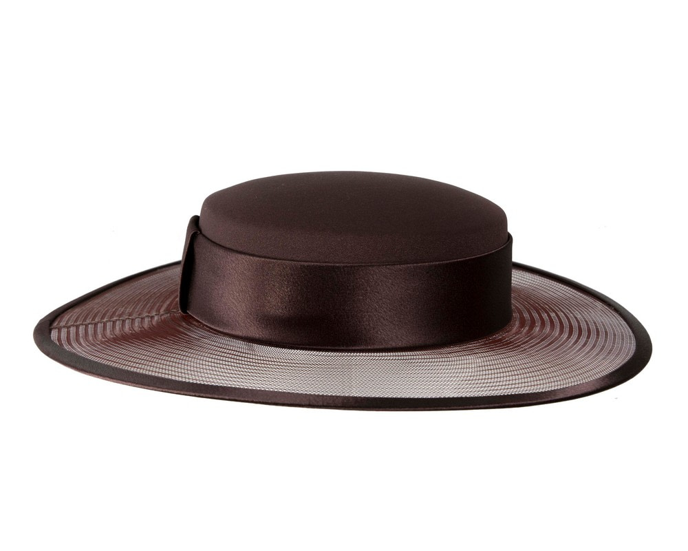Chocolate boater hat with wide brim designed and made in Melbourne by our professional milliners. Each hat is individually crafted to perfection and will be a perfect addition to your Mother of the Bride or any special occasion outfit.
