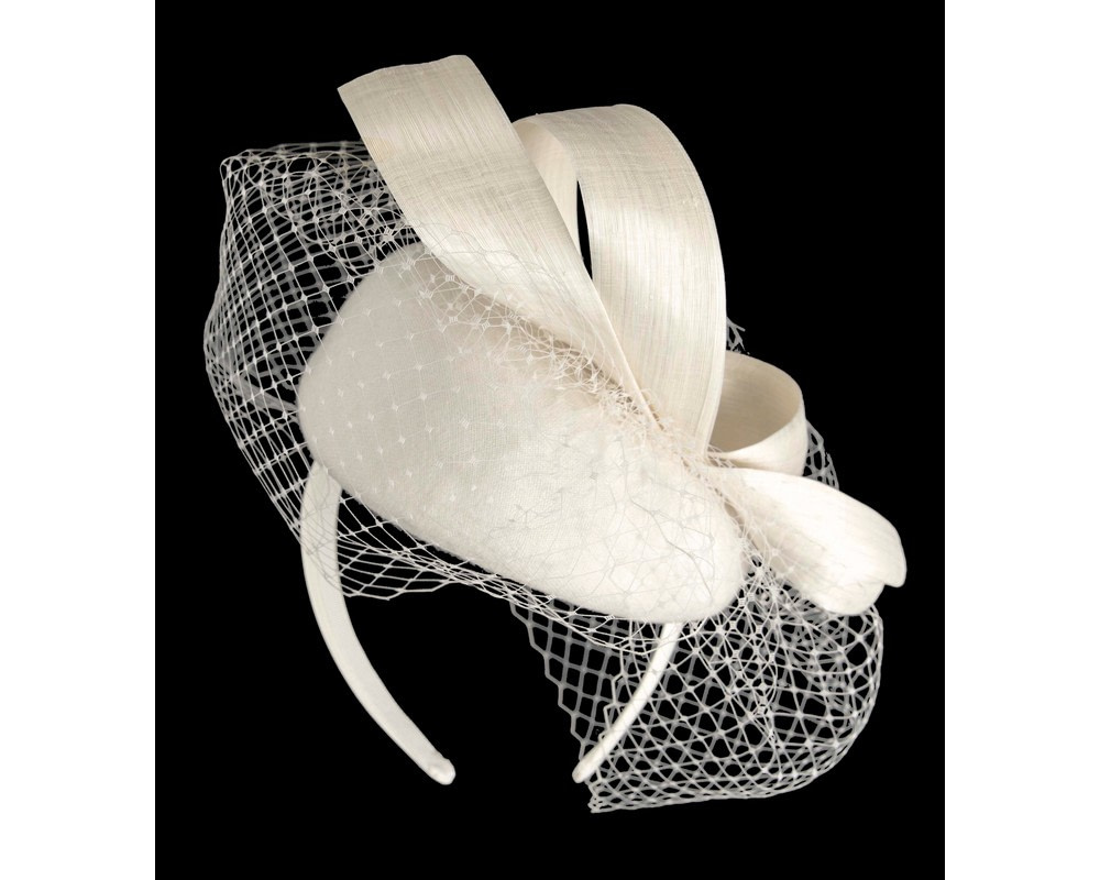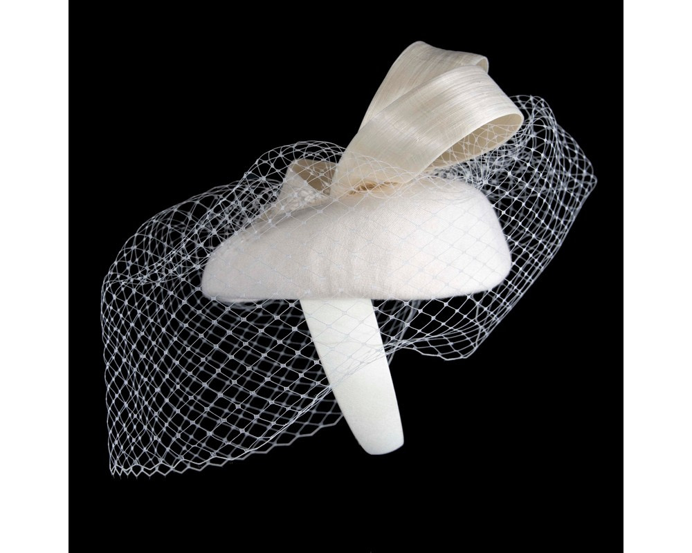 Cream woolen pillbox fascinator decorated with matching silk abaca loops. With addition of fashionable face veil, this fascinator will be a great addition to any autumn or winter racing or special occasion outfit.