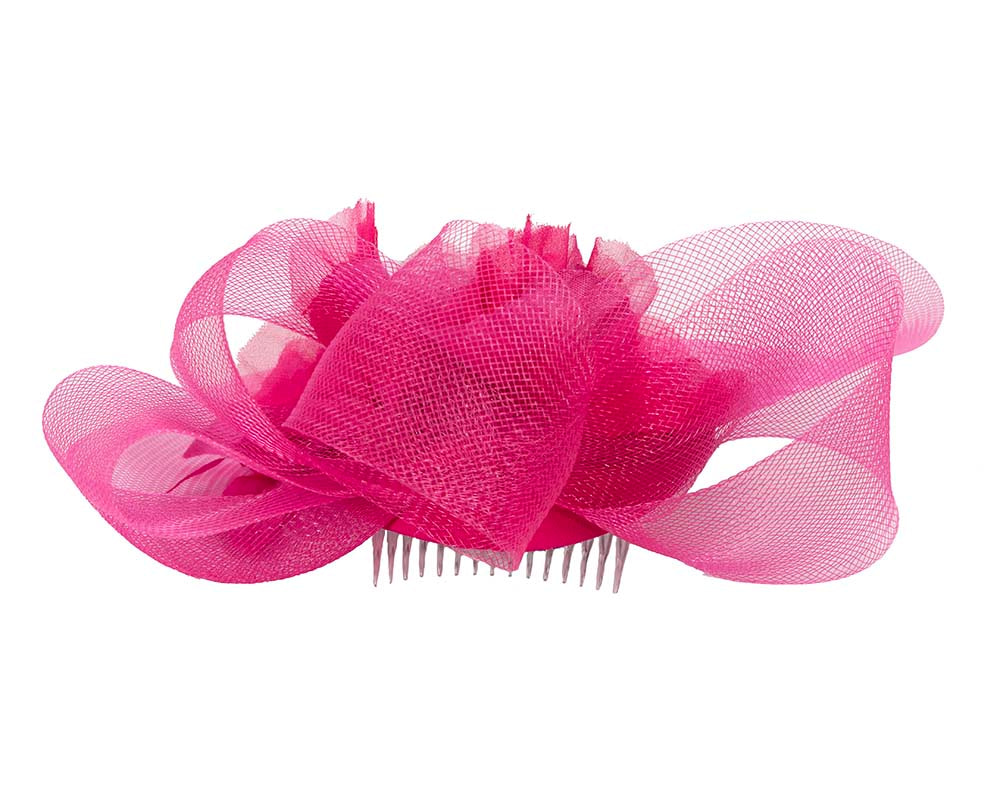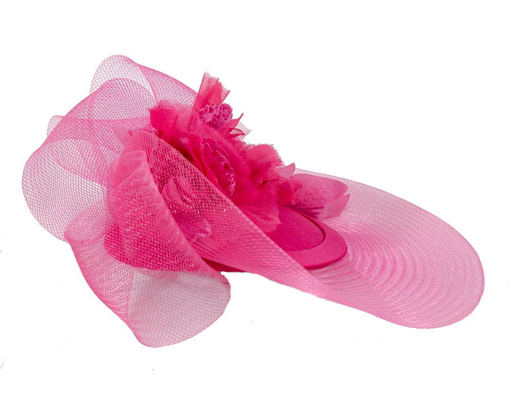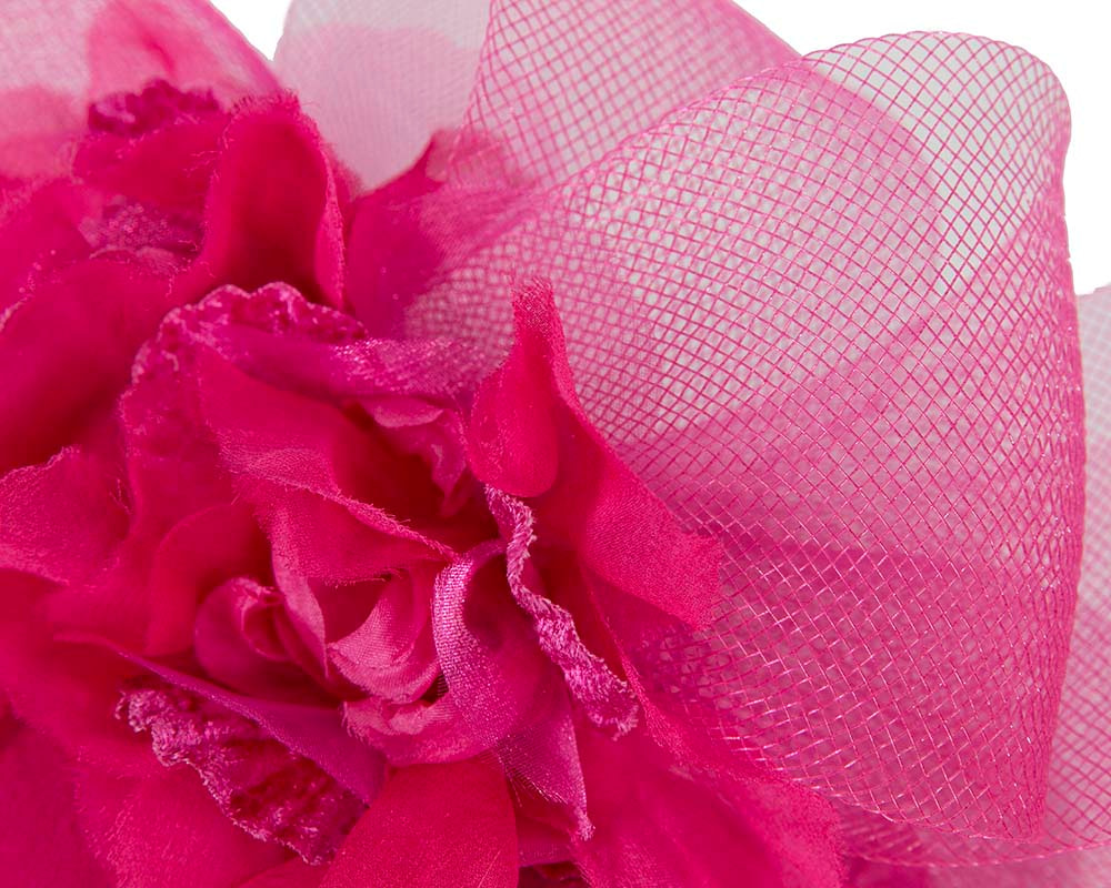 This elegant fuchsia cocktail hat is hand made in Australia from luxurious fabric with large tonal flower bunch. It is an excellent choice for any racing carnivals or special occasion, such as weddings.