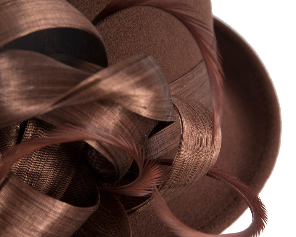Exclusive chocolate brown felt winter fashion hat from latest Fillies Collection. Elegant shape decorated with silk abaca loops and feathers. Perfect for everyday wear or winter race events.