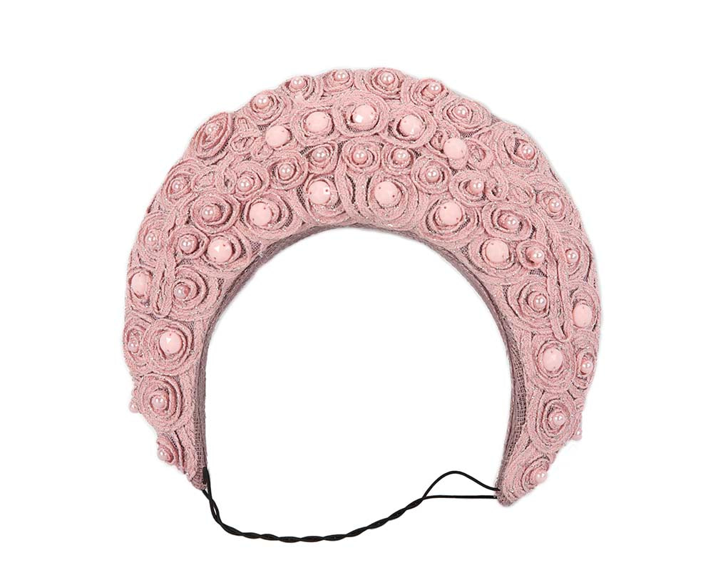 Modern dusty pink headband, hand-blocked from sinamay and covered in luxurious lace. Made in Australia by Cupids Millinery Melbourne