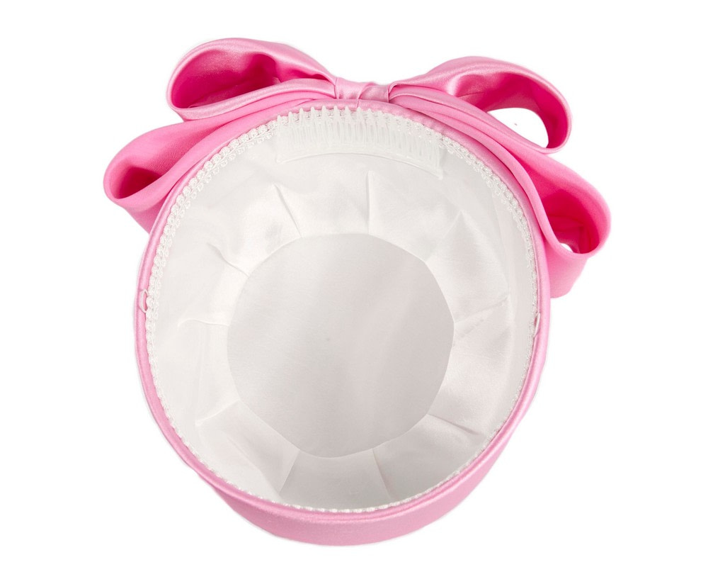 Covered in luxurious pink fabric, this hat is the latest fashion craze. Large pillbox decorated with elegant bow on the back.