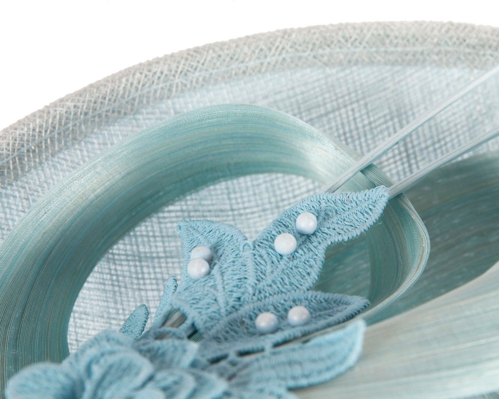 Stylish light blue fascinator decorated with silk abaca loops, luxurious lace ornament and two long feather sticks. Perfect choice for your next racing outfit.