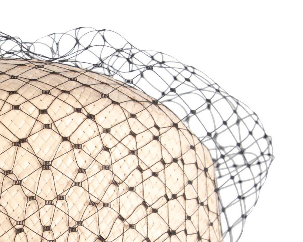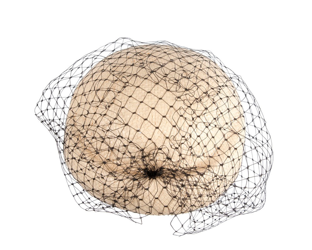 Large natural colored sisal straw pillbox hat decorated with black veil.