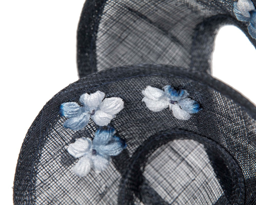 Exquisite navy fascinator from latest Max Alexander racing collection. Hand made loops of real sinamay decorated with small matching flowers.