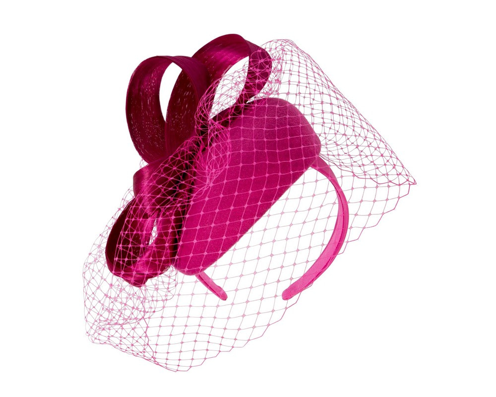 Fuchsia woolen pillbox fascinator decorated with matching silk abaca loops. With addition of fashionable face veil, this fascinator will be a great addition to any autumn or winter racing or special occasion outfit.