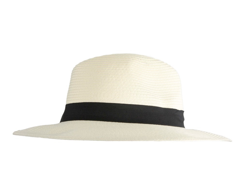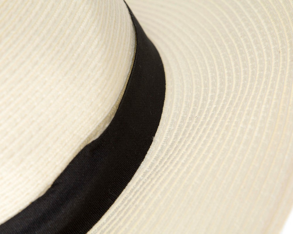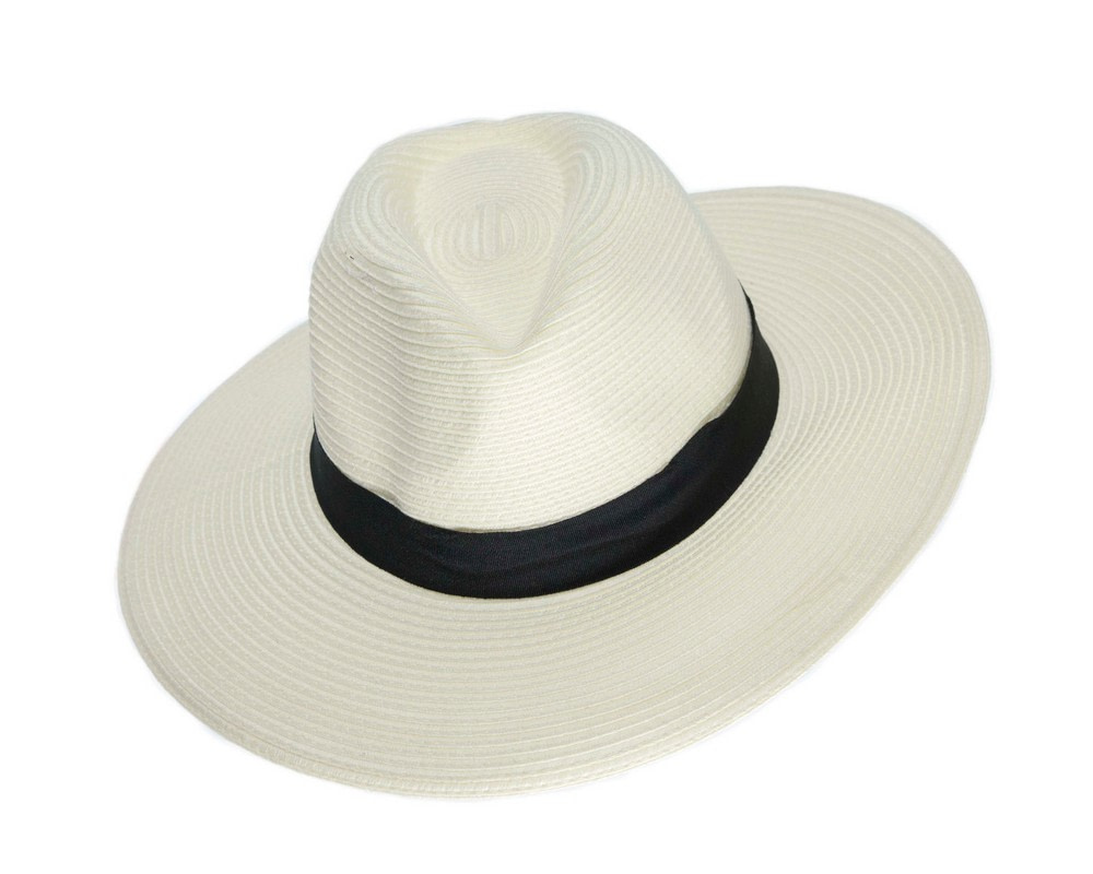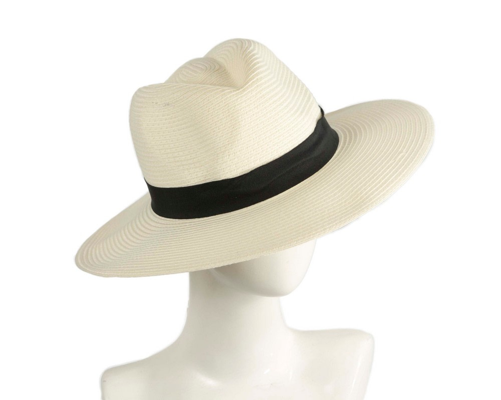 Hat is made from ivory-colored braid with black hat band. Featuring classic fedora trilby shape with wide brim, hat will fit anyone and is a perfect choice for the hot summer days.