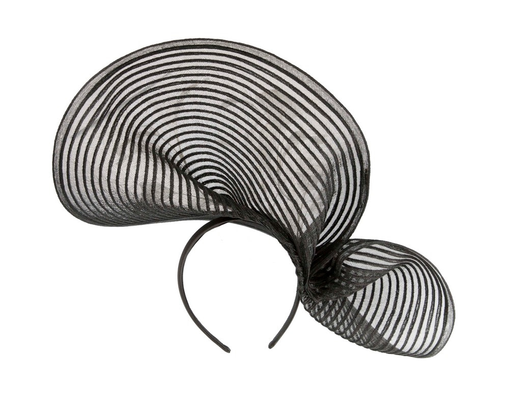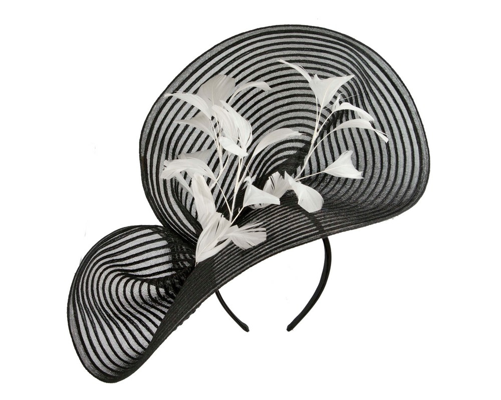 Exclusive one-off creation by Cupids Millinery Melbourne artisans. Large braided black crinoline base expertly shaped into a perfect racing accessory with addition of contrast white feather tree.