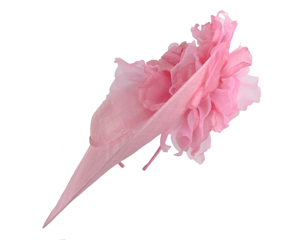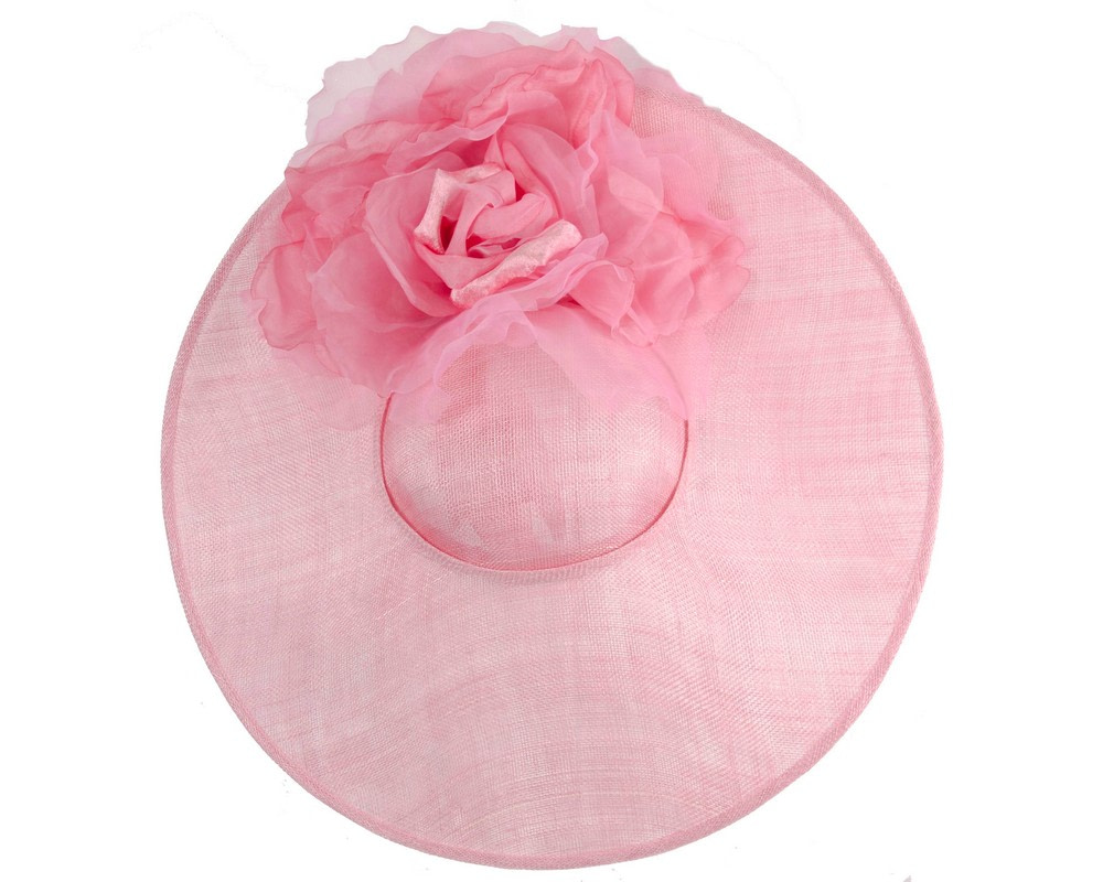 Latest Fillies Collection racing fascinator. Large pink hat base, topped with hand-made pink silk flowers, this fascinator will turn heads when you wear it at Melbourne Cup, Ascot or your local racing event.