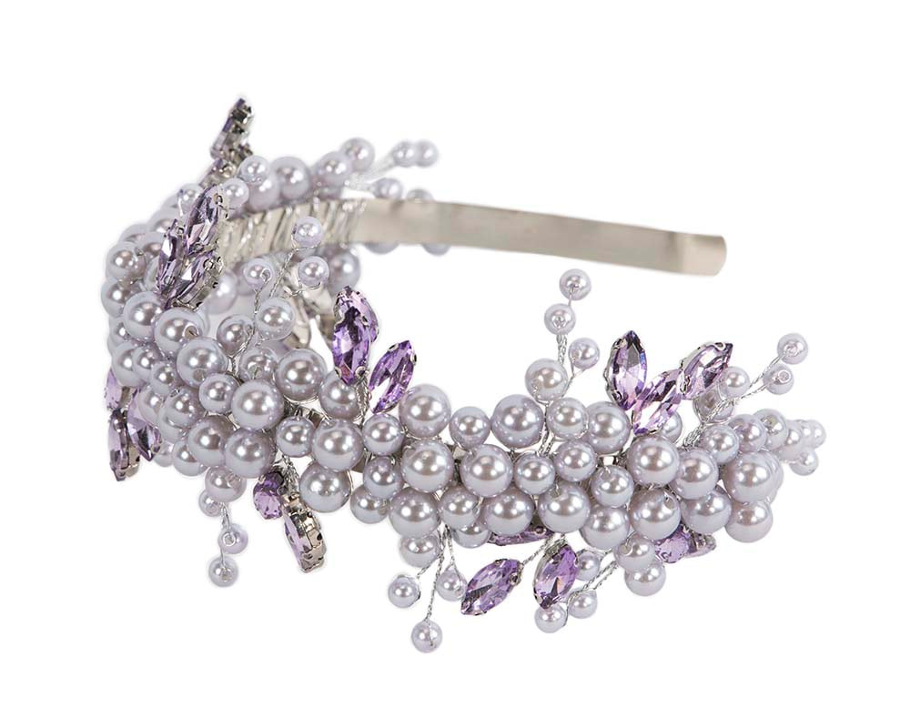 Lilac metal headband fascinator covered in pearls and crystals. Perfect racing accessory.