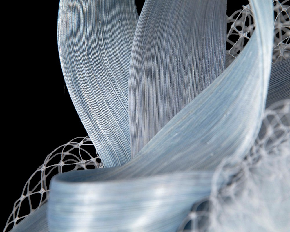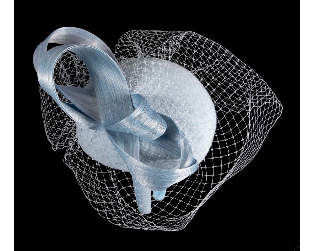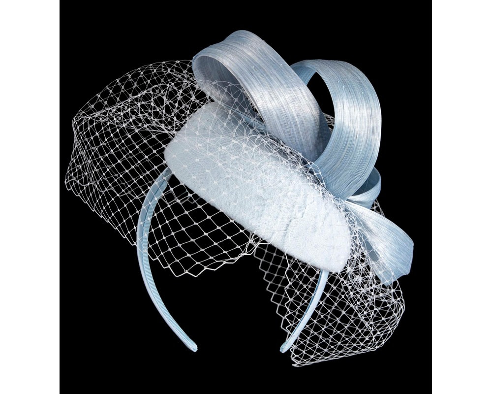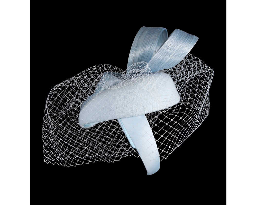Light Blue woolen pillbox fascinator decorated with matching silk abaca loops. With addition of fashionable face veil, this fascinator will be a great addition to any autumn or winter racing or special occasion outfit.