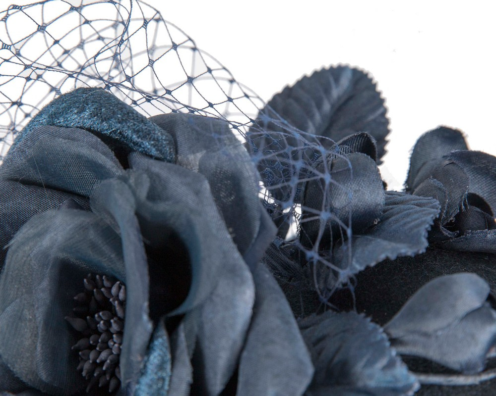 Carefully crafted navy wide headband covered in luxurious woolen fabric and decorated with matching hand-made silk flower arrangement and netting. Perfect choice for your next autumn and winter racing outfit or formal occasion.