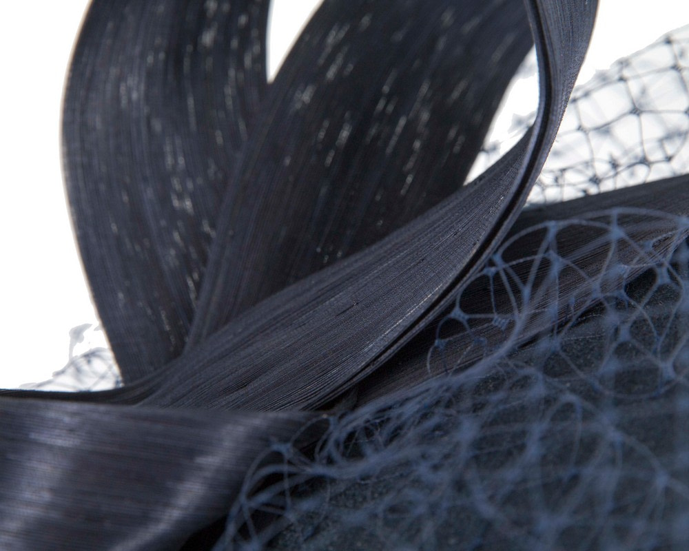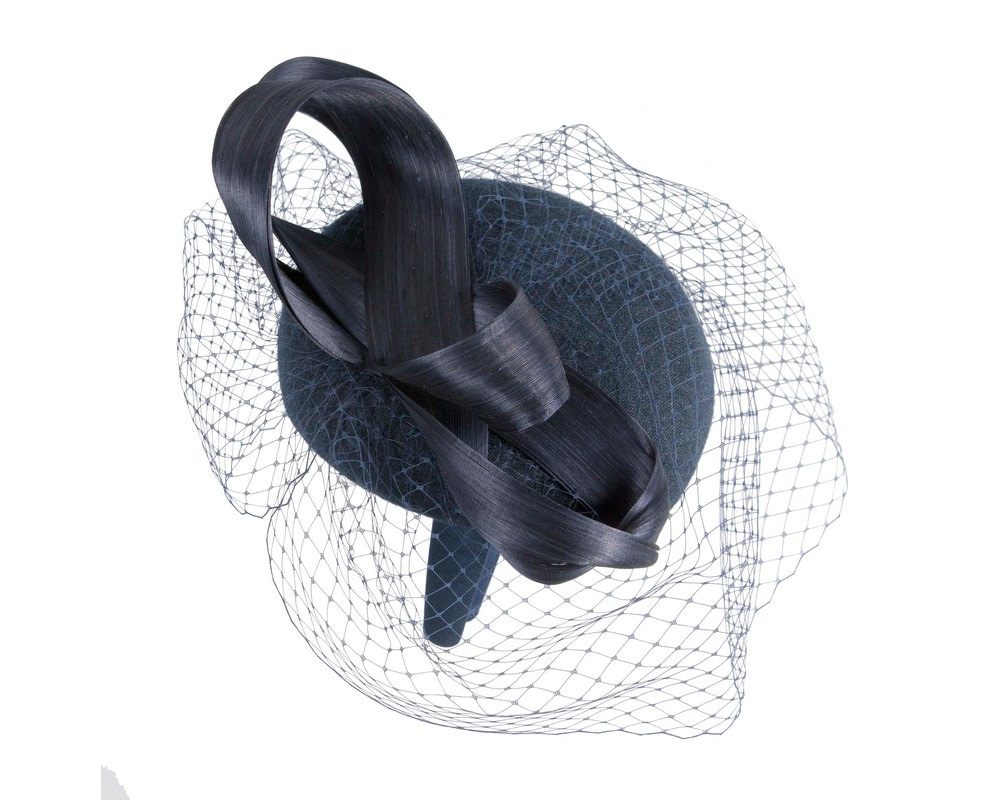 Navy woolen pillbox fascinator decorated with matching silk abaca loops. With addition of fashionable face veil, this fascinator will be a great addition to any autumn or winter racing or special occasion outfit.