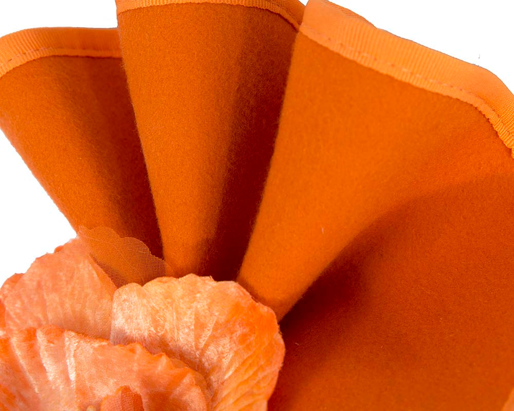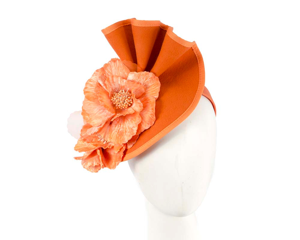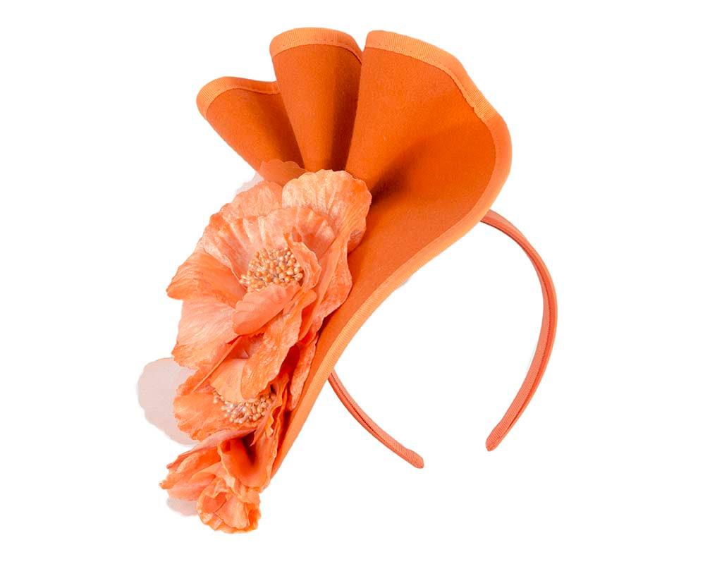 Elegant orange fascinator hand-crafted from pure wool felt and decorated with matching flower arrangement.
