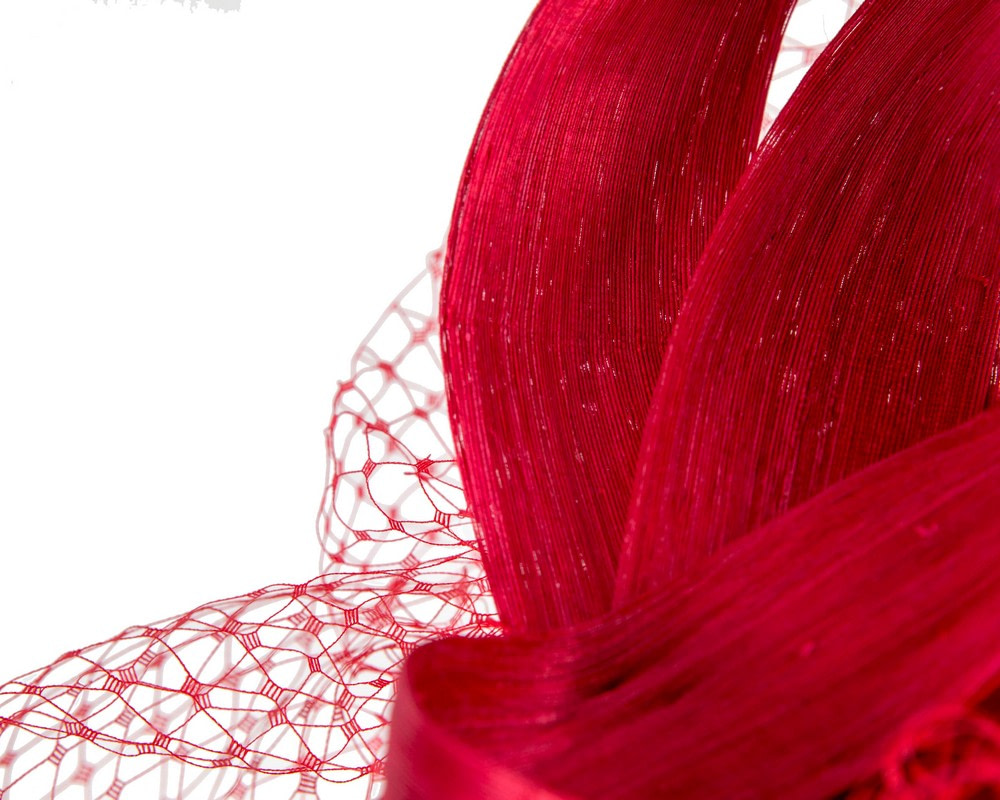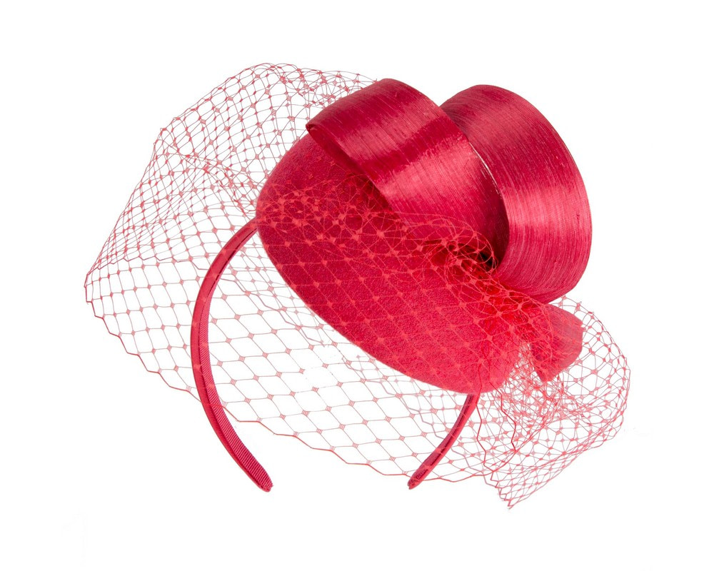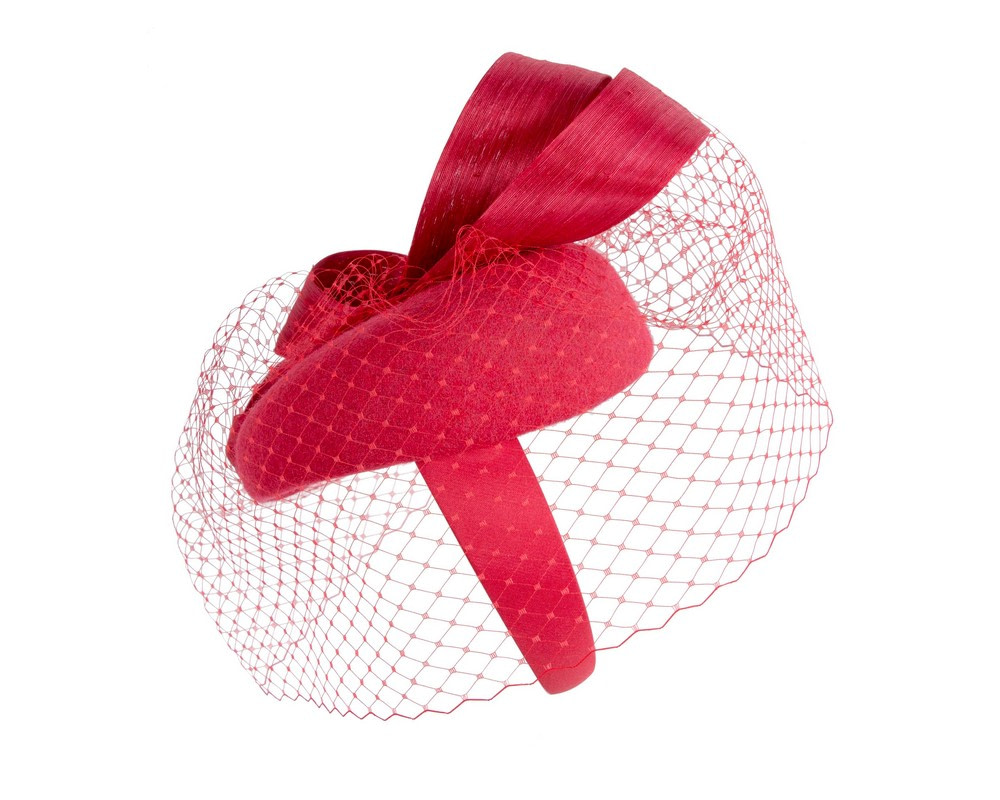 Red woolen pillbox fascinator decorated with matching silk abaca loops. With addition of fashionable face veil, this fascinator will be a great addition to any autumn or winter racing or special occasion outfit.