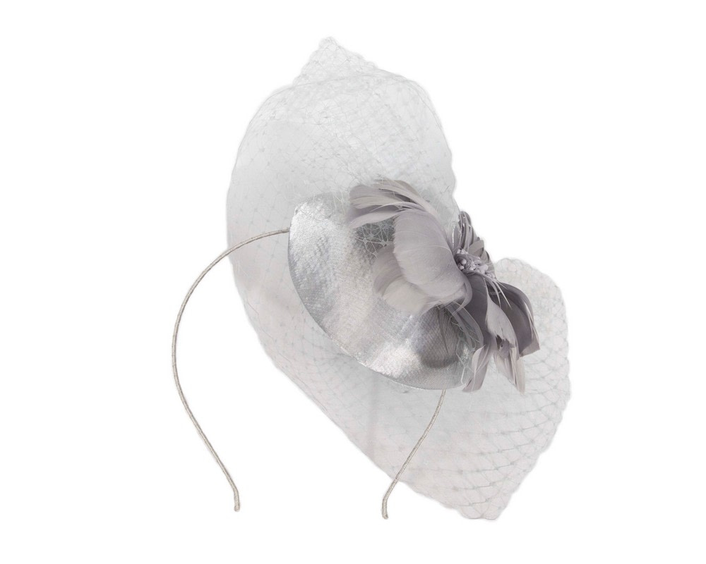 Round silver base covered in luxurious sateen and decorated with feather flower and face veil. Great choice for your next spring racing outfit.