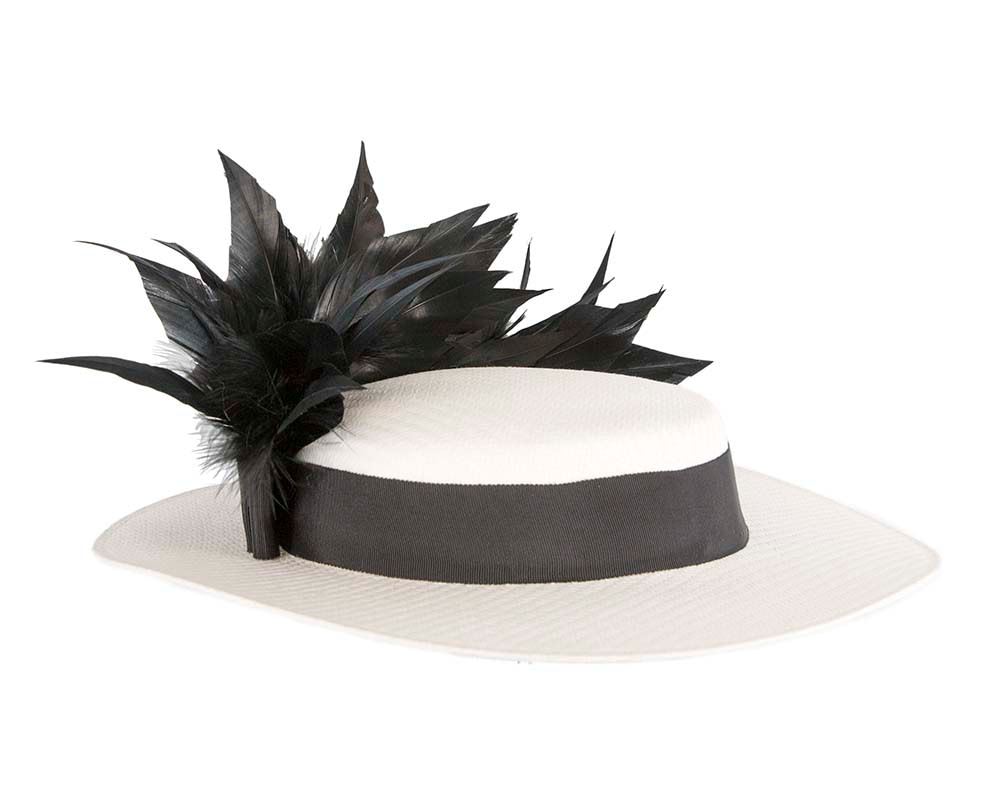 Latest in fashion — white & black boater hat from latest Max Alexander collection. Trimmed with feather cocktail, this light and elegant boater hat will be a perfect accessory to wear at race day.