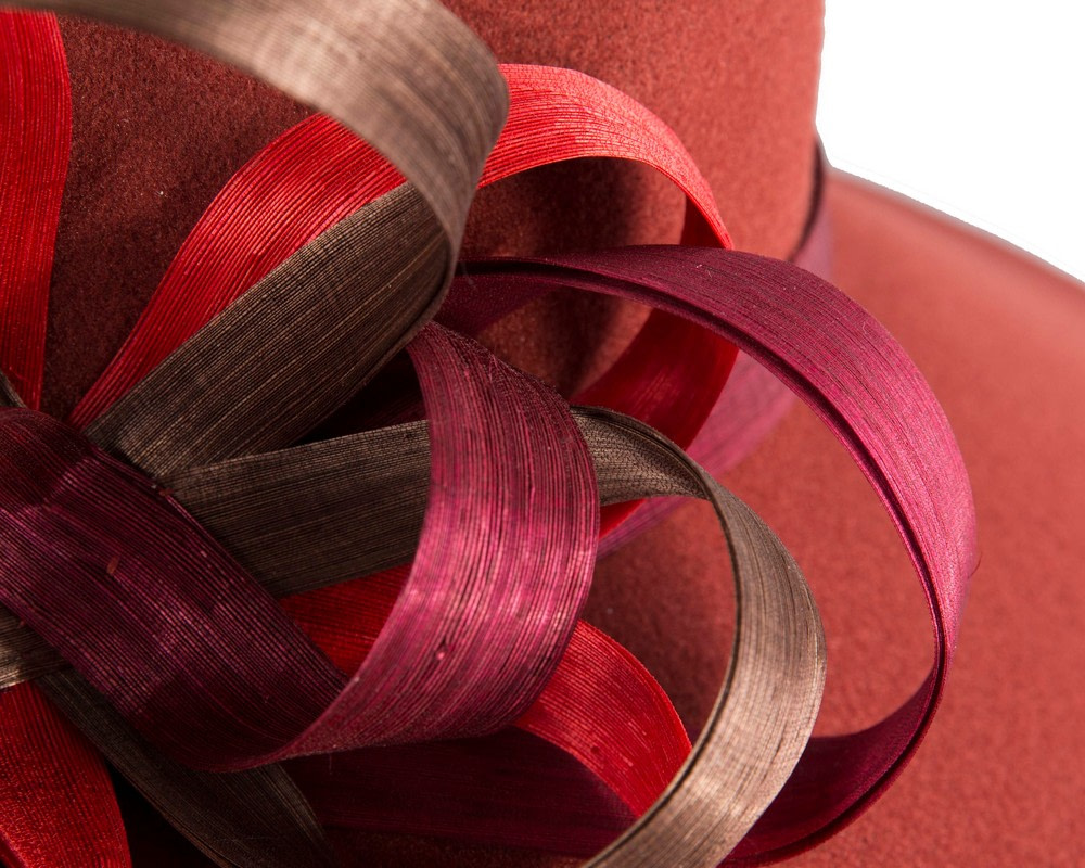 Classic rust orange wide brim hat decorated with hand-made silk abaca loops. This elegant creation is made in Australia by our skilled milliners and it is a great choice for your next stylish autumn or winter outfit.