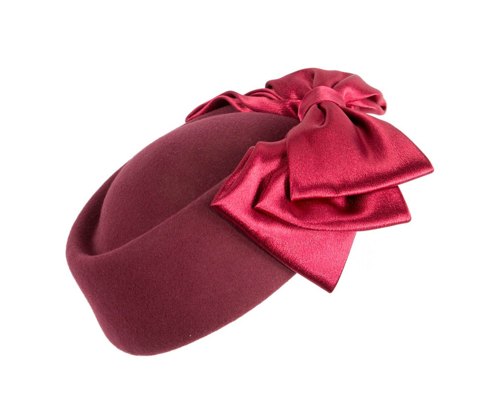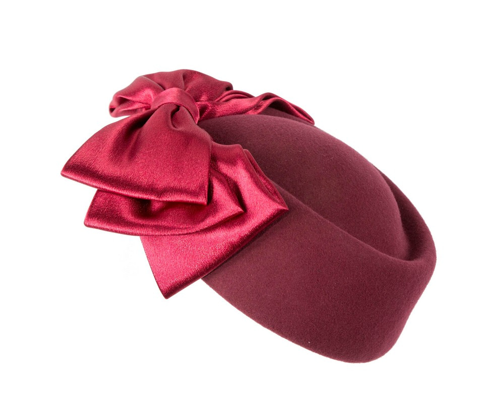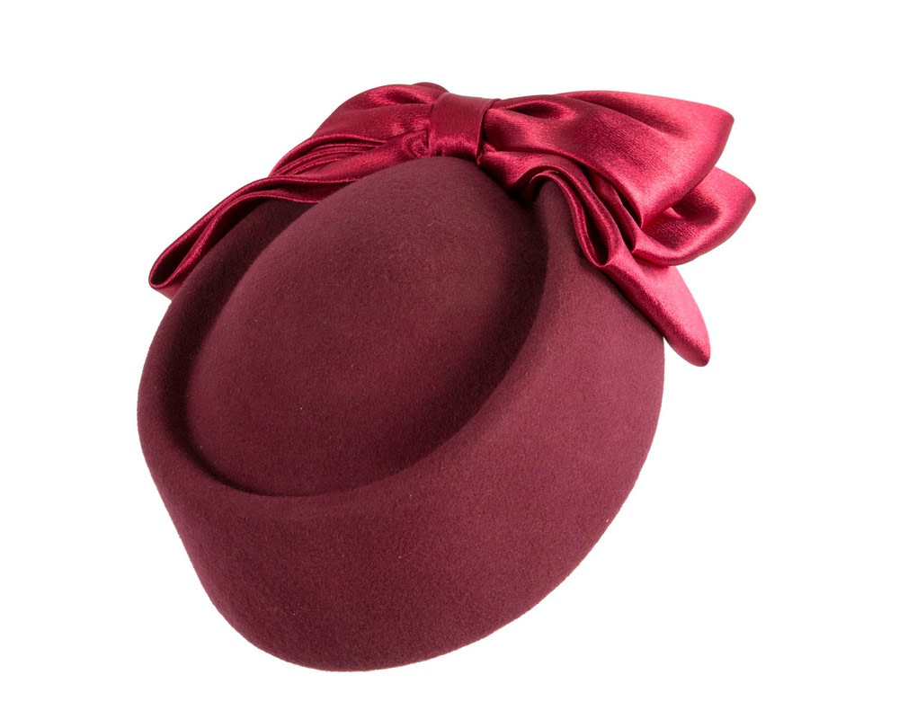 This elegant burgundy wine pillbox hat by Fillies Collection is a timeless piece of race day and formal headwear. Inspired by the iconic style popularised by Jacqueline Kennedy Onassis, the design features a structured felt base finished with a soft fabric bow for a refined and feminine look.